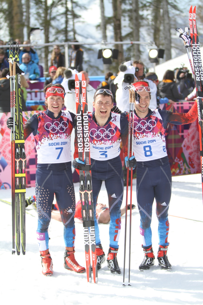 Alexander Legkov (center) and Maxim Vylegzhanin (left) are among the skiers served provisional suspensions for doping violations at the 2014 Olympics. Along with Ilia Chernousov (right, not suspended), they swept the 50 k mass start in Sochi.